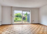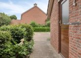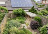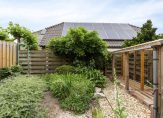 Vanuit de woonkamer loop je de achtertuin in. Een poort geeft toegang tot een pad waarmee je achterom kunt komen.