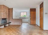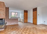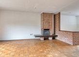 Grote ramen aan de voorzijde en een schuifpui aan de achterzijde zorgen voor veel lichtinval in de woonkamer. Het zitgedeelte met open haard is aan de achterzijde met ruimte voor het eetgedeelte.