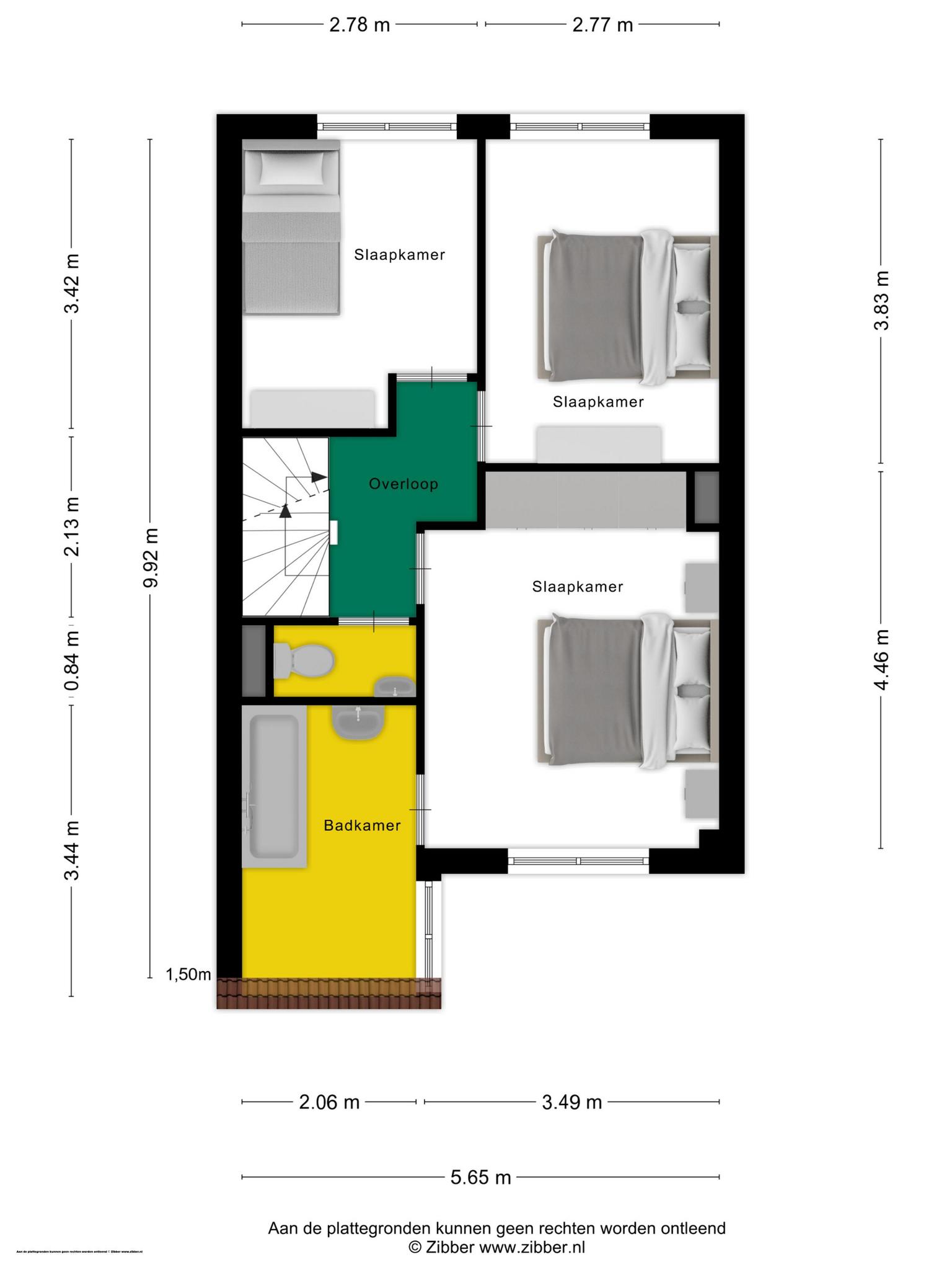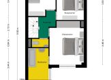Er is een vaste trap naar de tweede verdieping, waar als eerste een overloop/berging is. Hier hangt, naast de trap, de CV-ketel en aan de achterzijde is een dakvenster geplaatst.