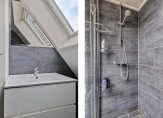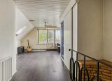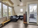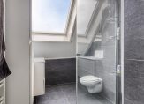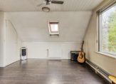 De overloop staat in open verbinding met een ruime hobby-/slaapkamer, die nu als tv- en muziekkamer in gebruik is. Deze ruimte grenst aan het dakterras en de badkamer (circa 10 jaar geleden vernieuwd) met een douche, toilet en een wastafelmeubel.