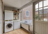 In de halfopen keuken staat een lichte hoekopstelling met een dubbele spoelbak, een ingebouwde gaskookplaat en een koelkast. Overige apparatuur kan los worden geplaatst, of kies je toch voor een volledig nieuwe keuken met inbouwapparatuur? Achter de deur met glas in loodraam is de verwarmde bijkeuken met de aansluitingen voor de wasmachine, droger en vaatwasser. De inpandig te bereiken garage, met een grote sectionaalpoort, heeft een oppervlakte van circa 29 m2.