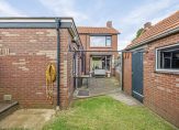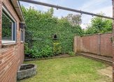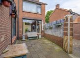Via de oprit loop je de achtertuin in, gesitueerd op het zuiden. Het eerste deel van de tuin is ingericht als terras en het tweede deel met een grasveldje. Er hangt al een metalen stang voor een schommel, dus de kinderen zullen blij zijn.