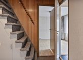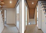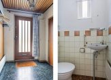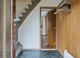 De jaren 60 architectuur van deze vrijstaande woning is fraai, met grote ramen en een overdekte entree. Achter de hardhouten voordeur is de hal met de bordestrap, de originele vloer en houten betimmering op een van de muren. Aan de linkerzijde, naast de meterkast, is de toiletruimte met fonteintje. De hal grenst aan een portaal, met de trap naar een wijn-/provisiekelder.
