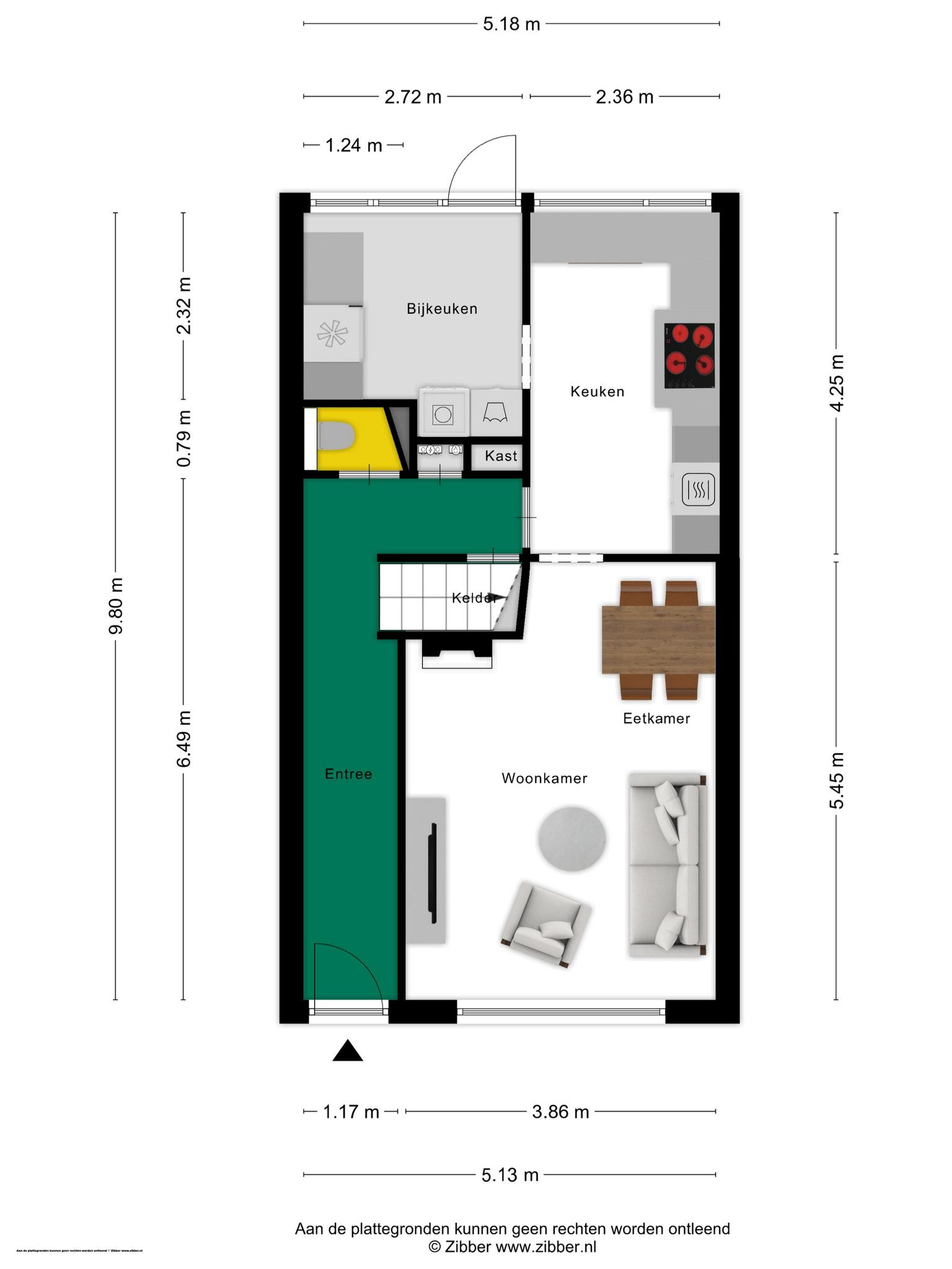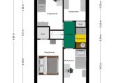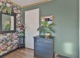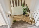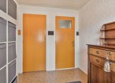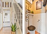 In de hal zie je direct dat dit geen standaard huis is met wit en grijs, maar een huis dat past bij de bewoners. De laminaatvloer ligt niet alleen in de hal, maar ook in de woonkamer. Aan het einde van de hal zie je de trapopgang, meterkast en de toiletruimte met authentieke stortbak.
