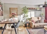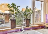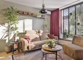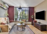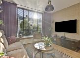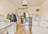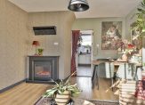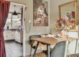 De keuken staat in verbinding met de woonkamer, met mooi uitzicht naar de voortuin en de rustige straat. Ook hier bepalen warme kleuren de sfeer en er ligt laminaat op de vloer. In de hoek, bij het zitgedeelte, hangt een airco-unit die kan koelen en verwarmen.