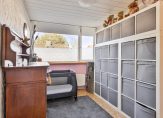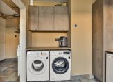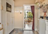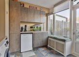 Naast de keuken is de bijkeuken, met praktische vaste kasten en ruimte voor een vriezer, de wasmachine en droger. Deze onmisbare ruimte heeft dezelfde tegelvloer als de keuken en een deur naar de tuin. Op de hele begane grond zijn in 2005 kunststof kozijnen geplaatst, met draai-/kiepramen en HR++ glas.