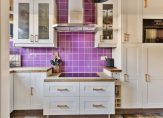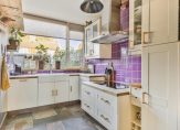 Aan het einde van de hal loop je de keuken in, met mooi uitzicht naar de tuin en een mooie tegelvloer. De hoekopstelling (2005) is voorzien van een dubbele spoelbak, mooi aanrechtblad en kleurrijke paarse wandtegels. Alle benodigde apparatuur is ingebouwd: een keramische kookplaat, afzuigkap, koelkast, vriezer, vaatwasser en een combi-oven. Het merendeel van de apparatuur is in de periode 2017-2021 vernieuwd.